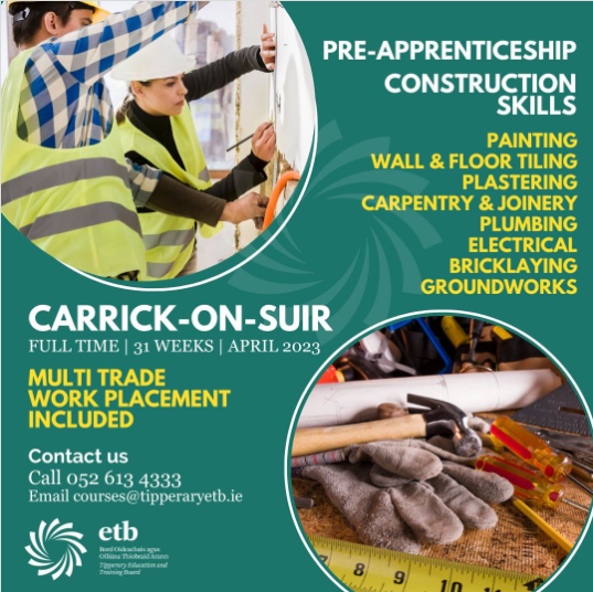 Pre-Apprenticeship: Construction Skills Course commencing 24th April 2023. This is a 31-week, full-time course and will be based in Carrick-on-Suir, Co. Tipperary.